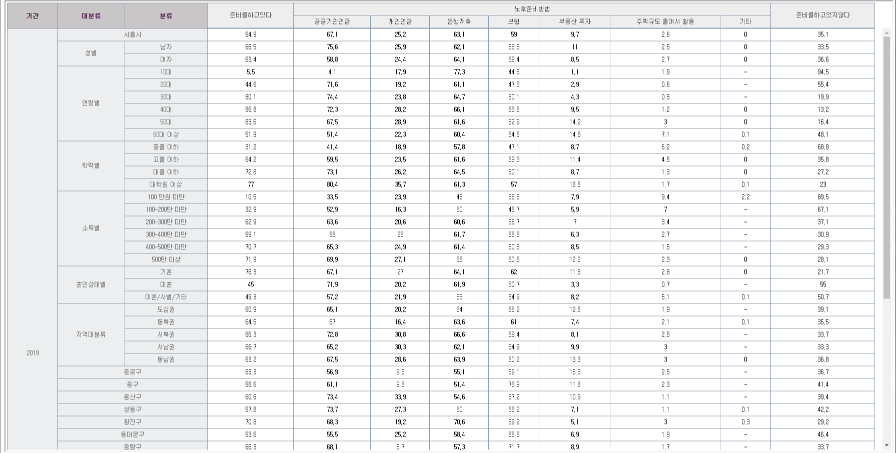 기혼자에 비해서 미혼(싱글)이 노후준비율이 매우 낮네요...