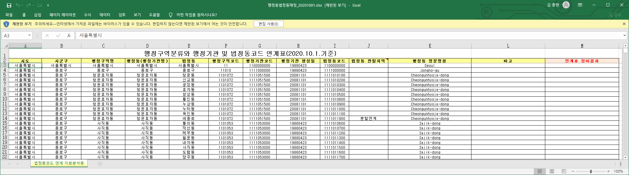 행정안전부에서 제공하는 자료들중 인구자료 같은건 유용한 자료가 많지만 법정동코드로 접근하게 되면 일치하지 않는 기준 때문에 난감할때가 많습니다.
